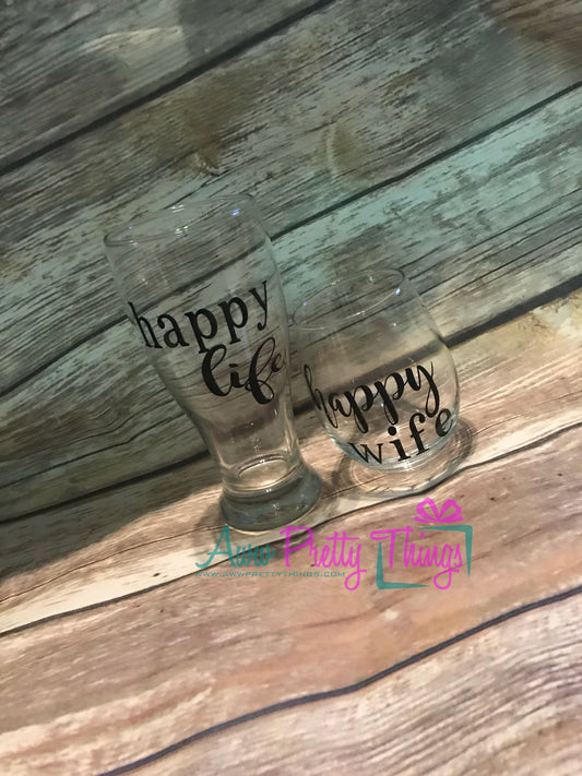 Happy Wife Happy Life Beer Mug and Wine Glass Set Couples Glass Set